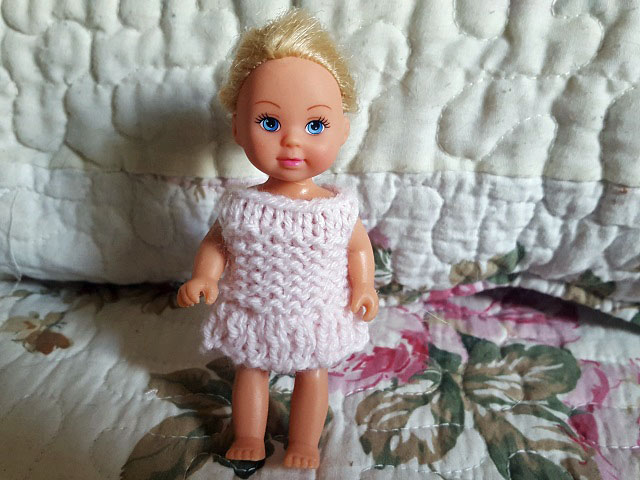 Trois mini poupées au fond d'un sac de jouets, sales, les cheveux en bataille et nues. Je les ai lavées, j'ai démêlé les cheveux et je leur ai tricoté des petites robes :